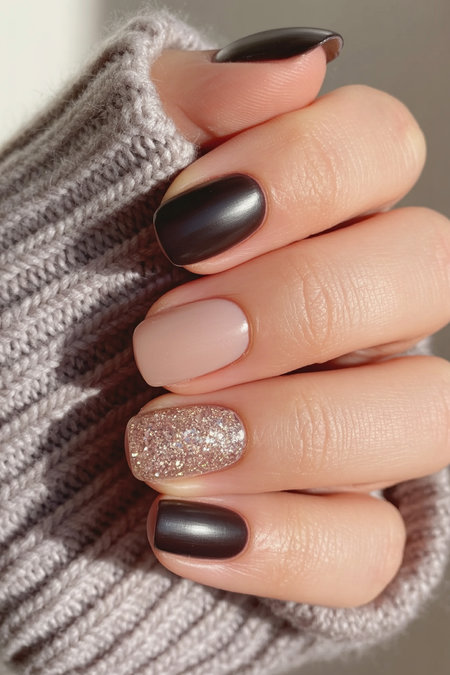 This combo may sound crazy but it actually looks amazing. Black matte chrome is edgy and modern, then you mix neutral nails with it. Maybe add some champagne glitter on one nail? It all works together somehow. Definitely makes people notice, but not in a bad way.