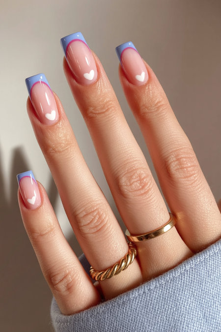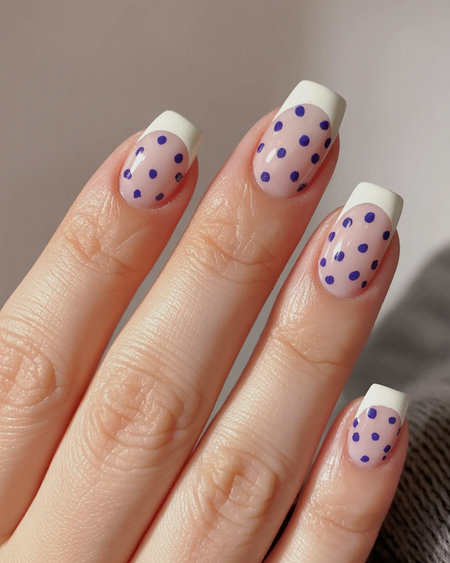 A fun twist on regular French nails. Instead of plain white tips you add blue polka dots! Either on the tips or the bottom part. It’s preppy and fresh. Kinda gives clean girl vibes but with more personality to it.