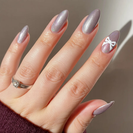 Tinsel nails is a thing now – it’s all about that shimmery/chrome silver look. The bow thing is still popular and I looove it. Shimmery silver is classic winter nails, too. Then you add a 3D or painted little bow accent on one finger and boom – it’s super cute! Girly but not too much.