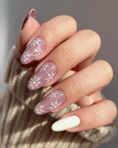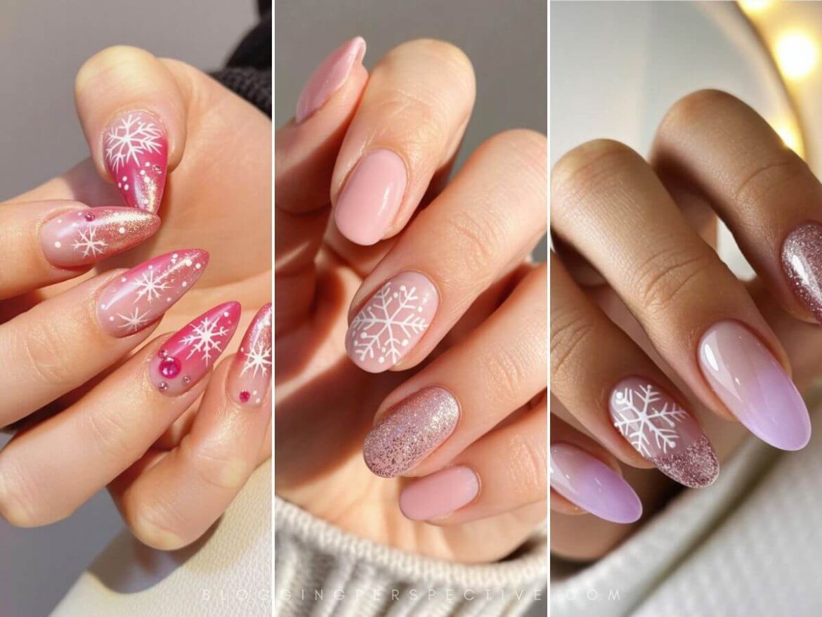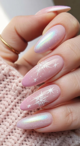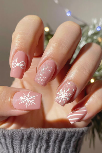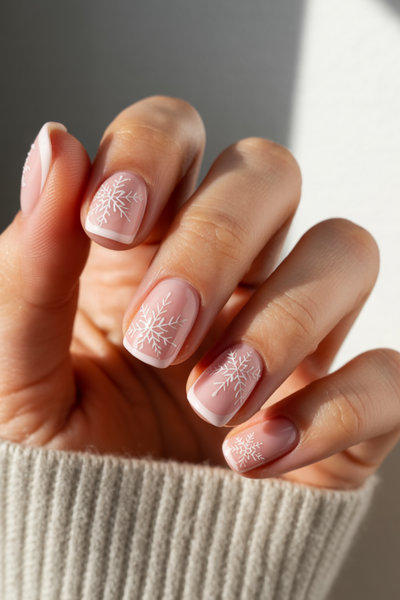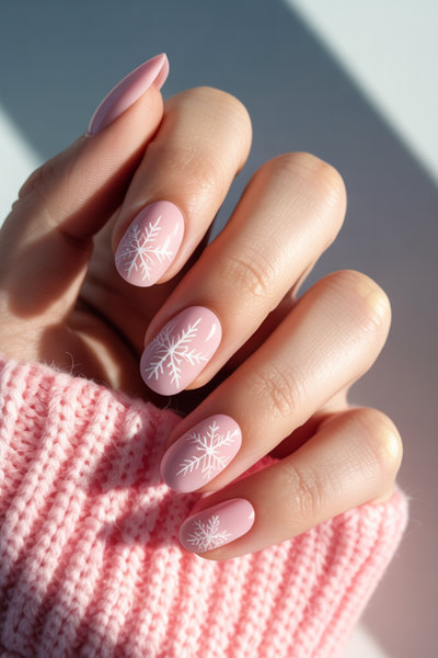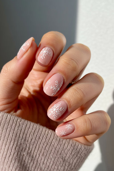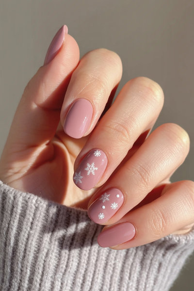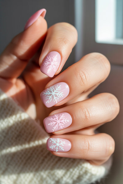 These ones are minimal and very cute. Light pink with large white snowflakes accents on all nails, really natural looking but still has winter vibes which is perfect.