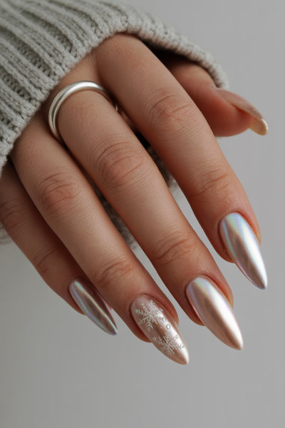 Chrome is everywhereeee now and this pink chrome looks so futuristic and festive at the same time. It catches light really pretty, and white snowflakes pop on the shiny background, people will ask about these for sure.