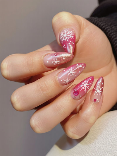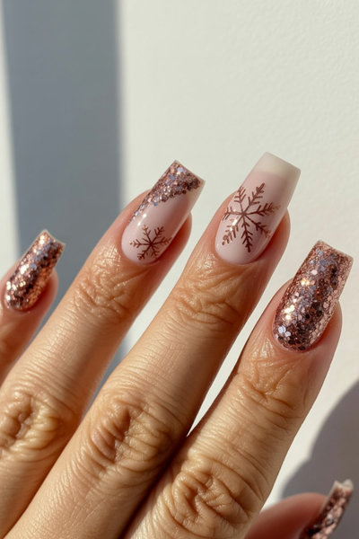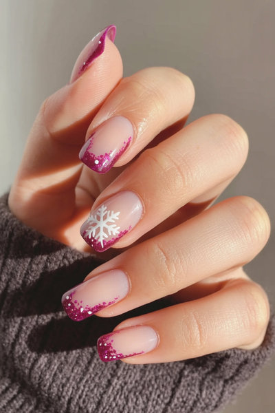 Go for bold magenta if you want something bright. Glitter tips add sparkle and dimension, one snowflake nail keeps it winter, and this has party energy more than the soft ones.