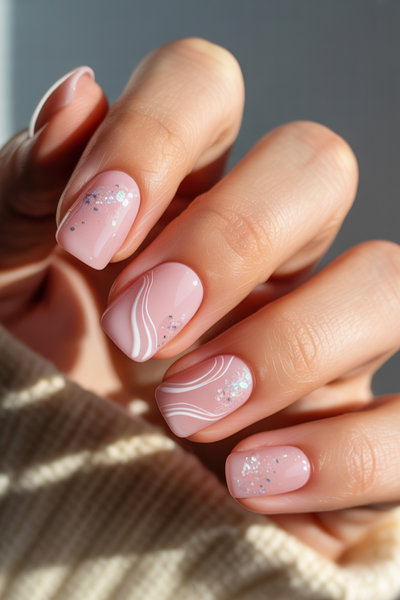 Simple is good sometimes. Pink has white swirls like wind blowing with little glitter pieces here and there, elegant without trying hard.