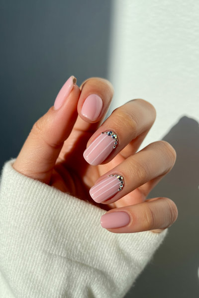 All the detail is at the cuticle with delicate row of rhinestones there. Rest of the nail is soft pink which balance out the fancy base, plus subtle and classy-looking line artwork. Fairly easy to do, but big impact.