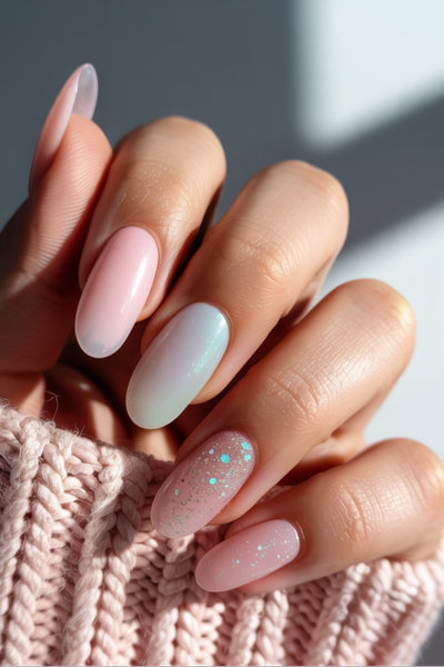 Pink and blue together is weird, but it totally works! It gives cotton candy vibes and snowflakes make it winter. Each nail is a different pastel, which makes it playful.