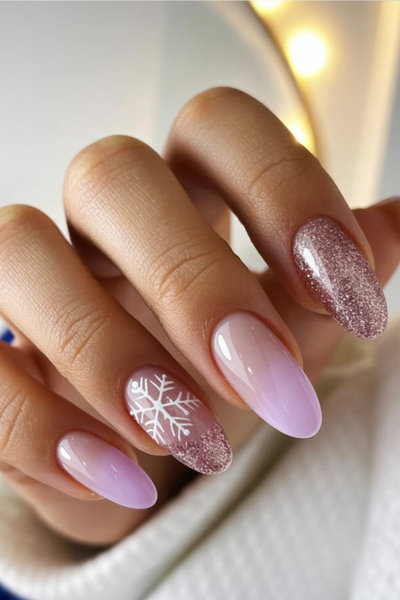 The color goes from fun pink ombre to rose gold glitter on the other nails. A snowflake accent is on one nail and it looks like perfection! Your fingers will look longer with ombre too.
