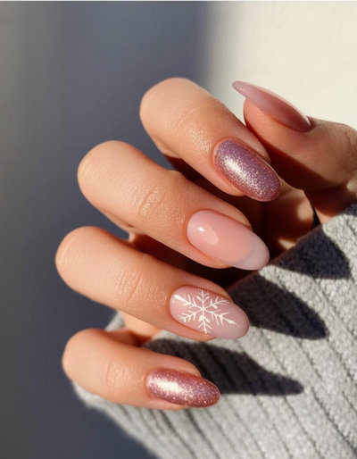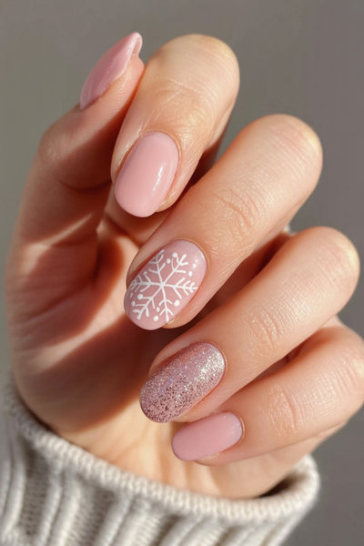 Less is more here. Blush pink has fine glitter mixed in for subtle sparkle, just one snowflake on one nail so its not plain but not decorated too much either.