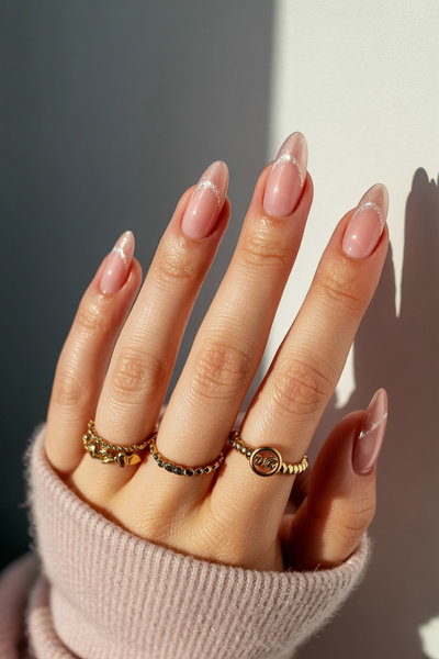 French tips with a twist cause silver glitter lines the pearly pink shimmery tips. The sheer pink base is classic, but the tips make this look updated and fresh.