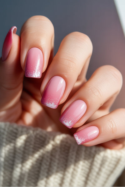 Bright pink fades to frosty glitter on tips, and it looks cool! Like your nails are getting covered in frost slowly, the colors catch your eye but still feels seasonal.