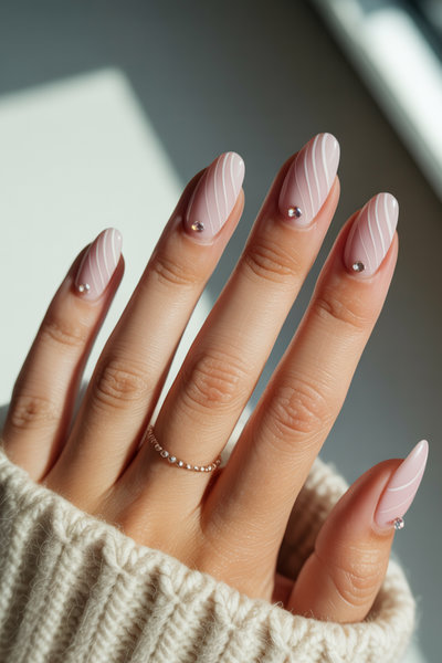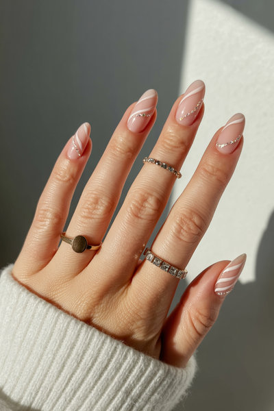 Milky pink is a pretty shade for a base color! These have flowing white lines that create movement with small gemstones placed around for bling. Everything is soft but interesting.