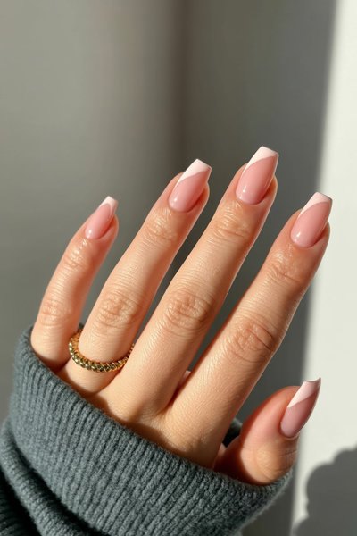 French tips but different! The light pink tips go on one corner of the nail, all you need is to draw a line and fill it in – easy! The sheer pink base is soft and the weird angles make it stylish and interesting.