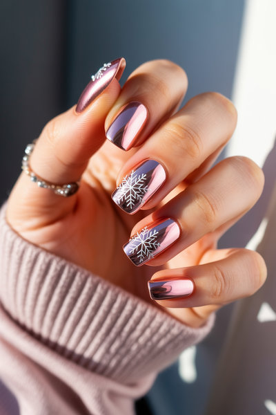Chrome again but more neutral/very light pink. This chrome is more subtle so you can wear it everyday with anything, white snowflakes add winter without being too much on the shiny part.