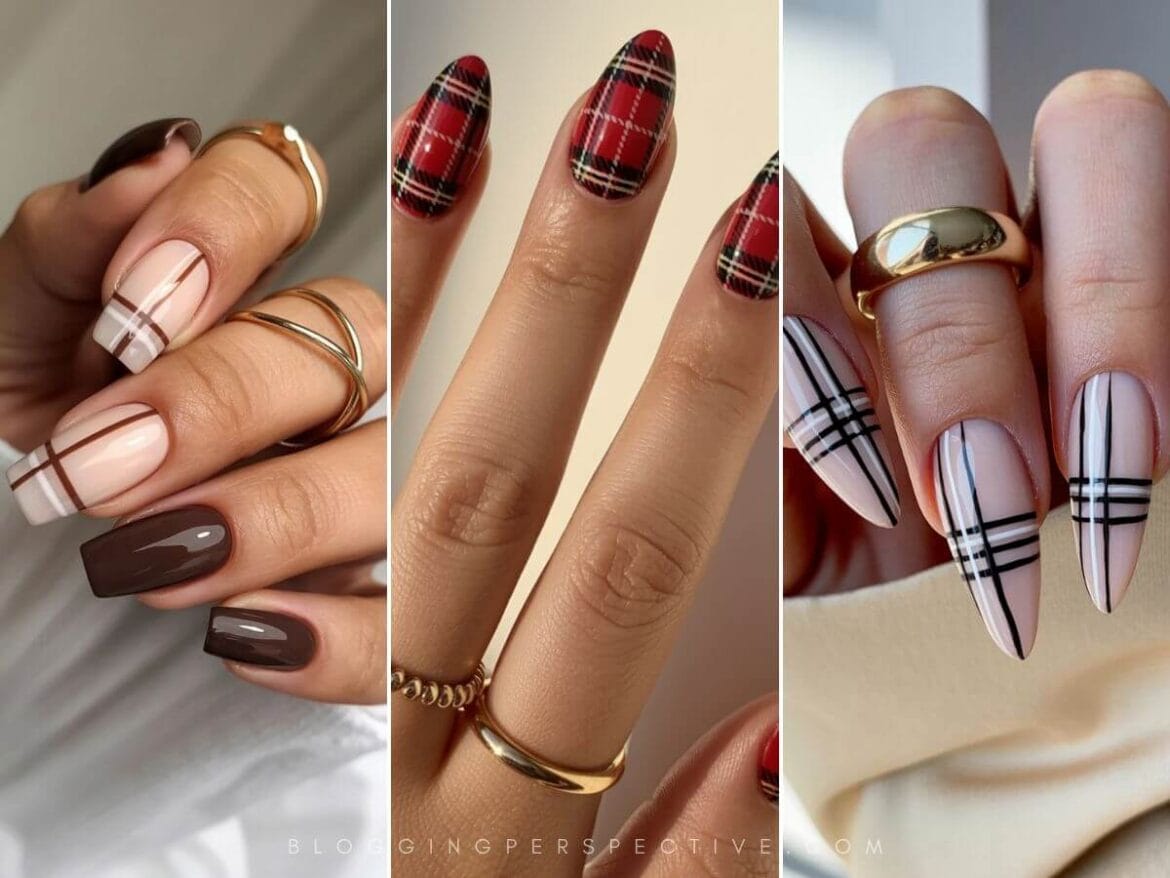 Switch it up: stick with dark brown all over and minimal plaid on selected nails. Pair with red or burgundy stripes for a little lift. These work for anyone who wants warmth without screaming I ironed my flannel this morning.