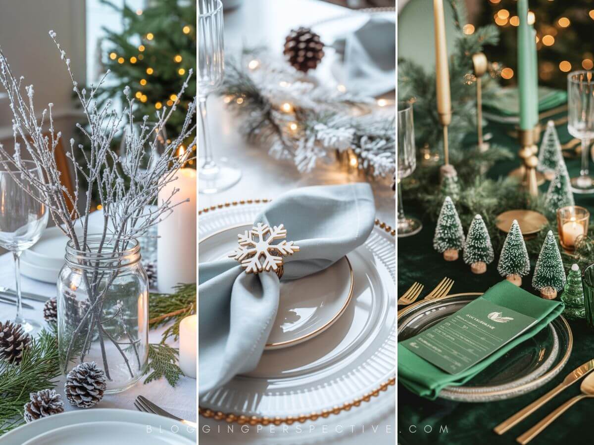 Silver and white is a great combo for a winter wonderland tablescape look – this pareticular table setting uses silver elements like placemets, Christmas tree figurines, and white one like table runner and little snowflake accents together. Add some glittery snowflake coasters and watch the whole table shine. This tablescape give total snow queen vibes and I loooove it.