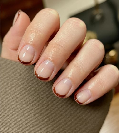 Chocolatey, skinny French tips on a sheer or milky base. Clean, chic, very “I drink cappuccinos and read.” Easy with a liner brush.