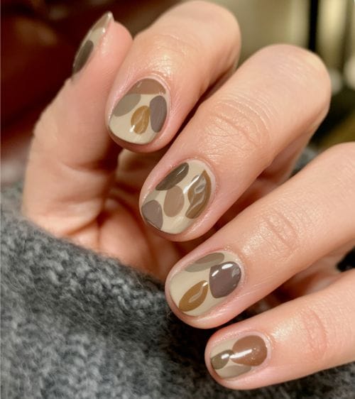 You want earthiness? Here’s basically pottery class in nail form. Swathes of terracotta, soft brown, and sage tumble over short nails. Each nail is a mini painting you won’t want to chip.