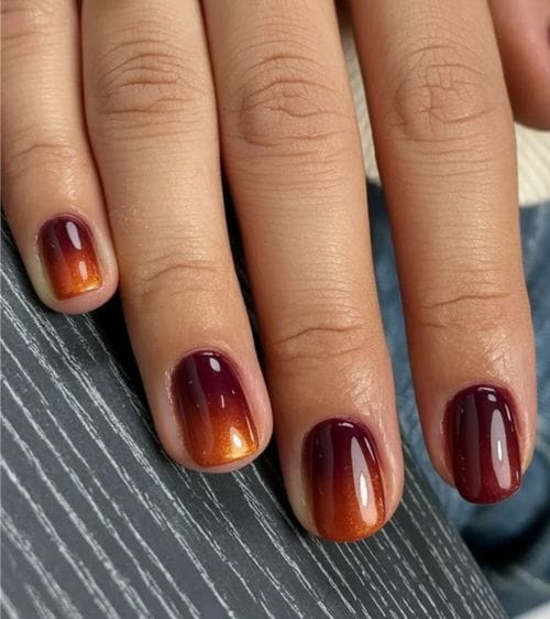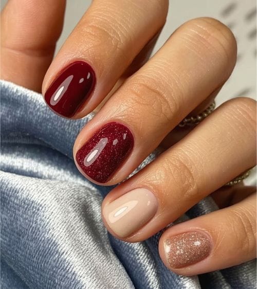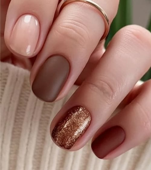 Go matte brown or burgundy, then add one bronze glitter accent. Rich, moody, and a little sparkly. Feels like velvet.