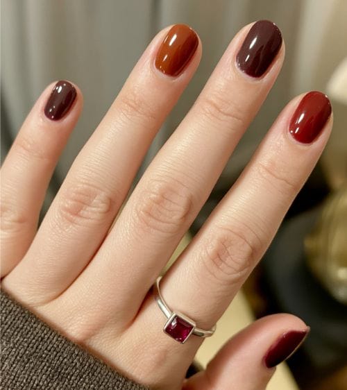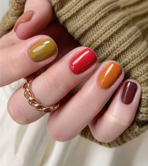 Paint each nail a different fall shade: caramel, pumpkin, olive, plum, cream. Zero nail art skills needed. Maximum cute payoff.