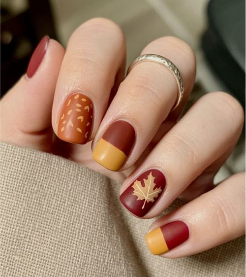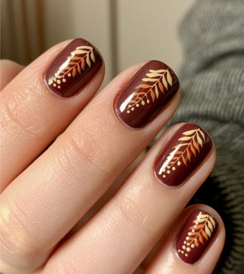 Burgundy or burnt orange base with tiny maple leaf accents in beige or gold. One leaf per hand is plenty. Cute and seasonal without shouting.
