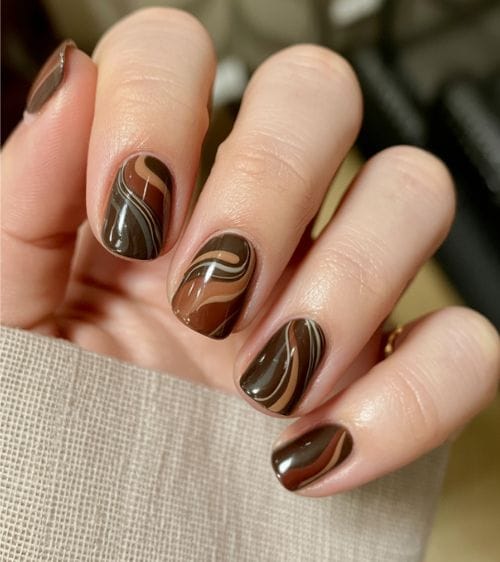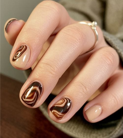 Take marble, shrink it, add coffee. Layer and swirl light and dark browns on short nails so every finger looks unique. Cozy and a bit chic.