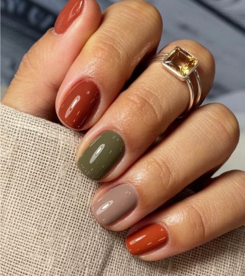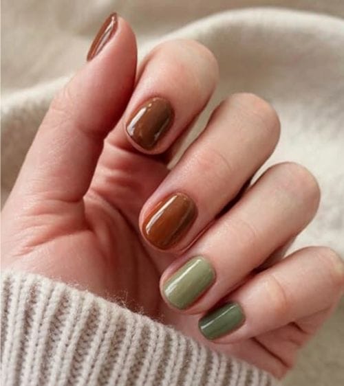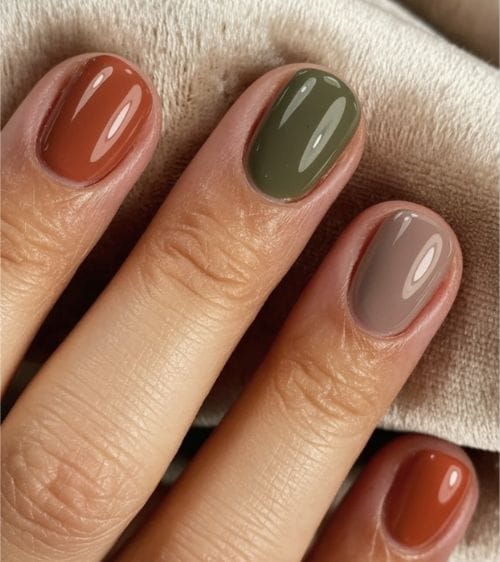 Pick five: rust, muted green, caramel, beige, rust, brown. Paint, top coat, done. Instant cozy-girl nails.