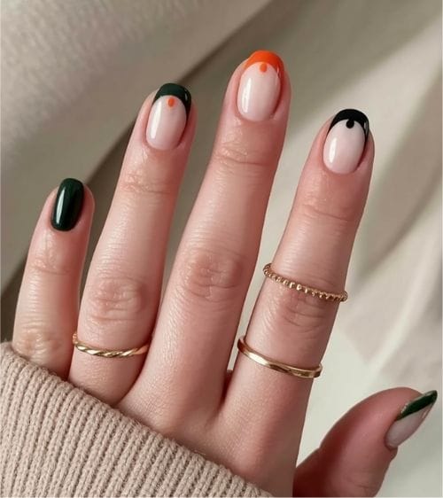 Halloween-adjacent but more versatile and super wearable. Thin black and orange tips, tiny dot accents near the tip. Cute, not costume-y.