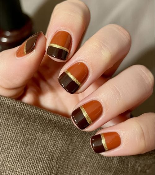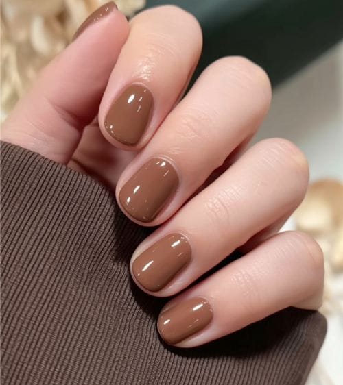 If you love dessert, you’ll get it. Short fall nails painted in chocolate brown and soft caramel shades, maybe alternating, maybe mixed. Snackable vibes, truly.