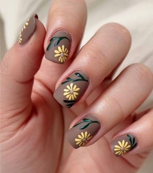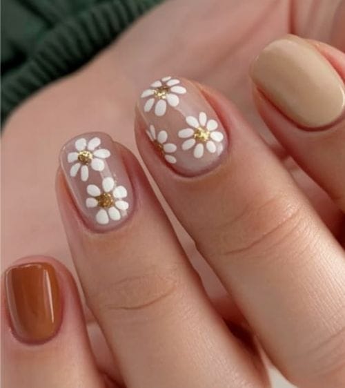 Short brown nails with subtle flower doodles look classic and playful. Dot white or gold centers for brightness. You’ll catch yourself staring.