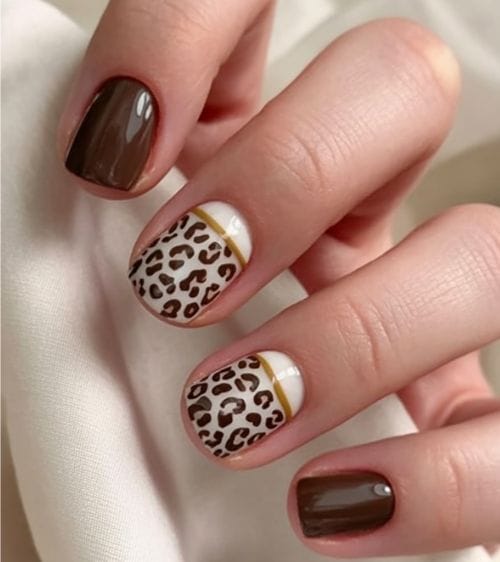 Mix solid brown nails with a couple leopard accent nails. Tiny spots, warm tones, instant cozy glam. Animal print, but subtle.
