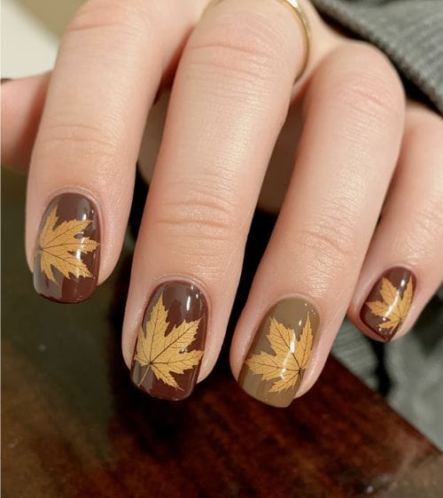 Autumnal brown or khaki base with detailed maple leaf accents on each nail. Go for yellow, beige, or gold. Like pressed leaves, but make it manicure.