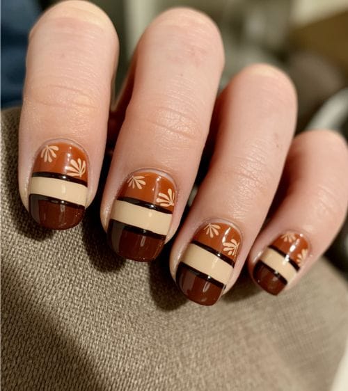 Classic brown nails with a twist. Outline a few leaves in orange or gold on top. Shaky lines read as handmade cozy vibes.