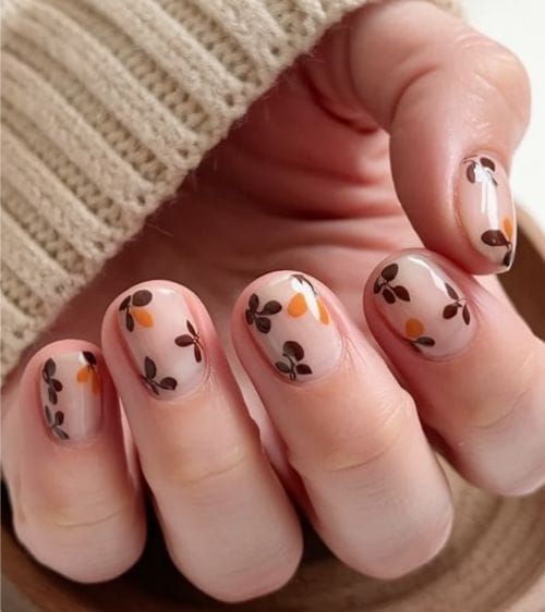 You don’t need a whole forest; just your hands will do. Tiny red and brown leaves scattered across a nude or beige base. Even if your leaves drift into blob territory, the seasonal flavor is strong.