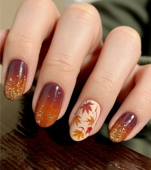 Fade purple to burnt orange, then add glitter over the orange tips a leafy accent nail or two. Looks advanced, but sponge the ombre, sticker the leaves, done. Cozy vibes.
