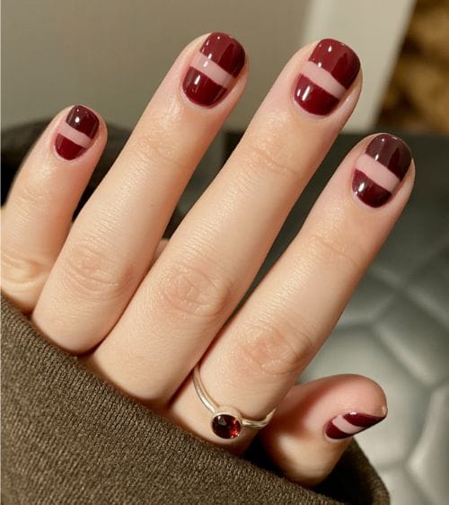 Deep burgundy base, add clean lines or triangles in beige or gold. Minimal, modern, fall-approved. Tape helps a ton.