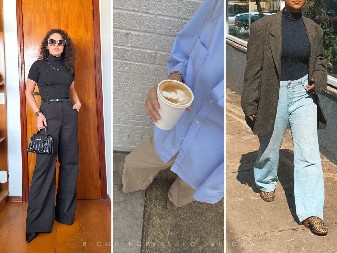 Vertical stripes on that light blue shirt are so flattering. Black wide leg pants balance out the pattern. White sneakers keep it modern – not too formal. Black belt with gold buckle adds a nice detail. The whole outfit feels polished but comfortable. Like you mean business but you’re not suffering. Perfect spring work outfits for business casual environments basically.