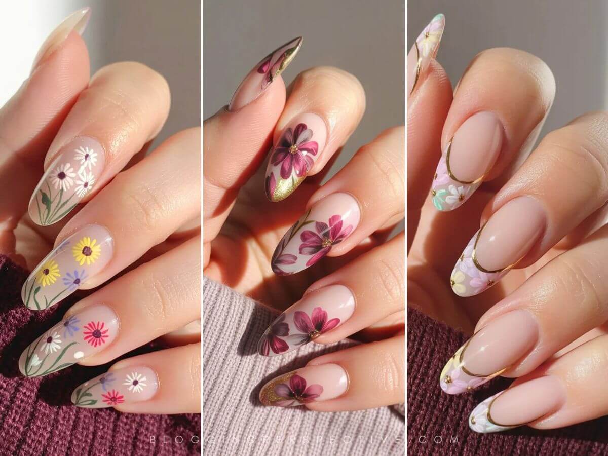 Almond nails with wildflowers everywhere. Nude, white, yellow, and pink colors! Like a meadow on your fingertips. Every flower is different. That makes it look natural not perfect, I love that about wildflowers.