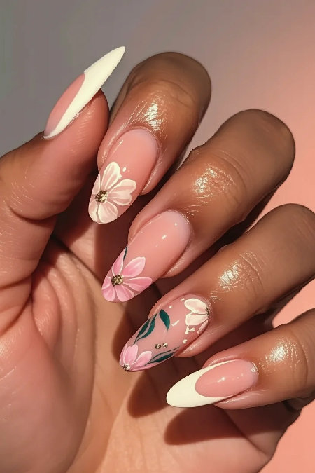 Skinny french tips are so much better than thick ones. They look more modern I think. The long almond shape makes your fingers look longer too. White floral accents keep it romantic but not over the top. Sometimes less is more with nail art honestly. These are the classy spring nails that work for fancy events but also just regular life. The flowers are minimal which I appreciate.