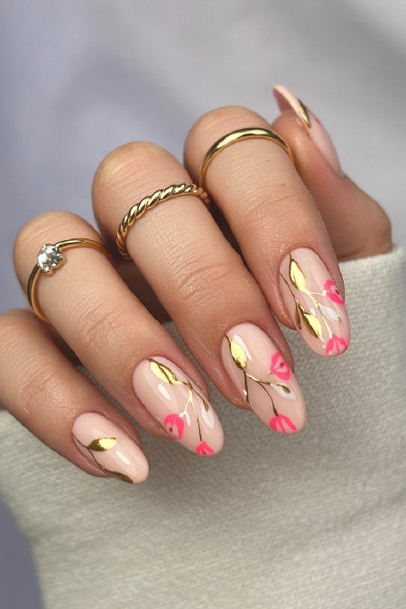 That milky white base is already gorgeous. Then the pale pink flowers with gold stems?? Like come on. So elegant. The gold makes it feel more expensive than regular nail art. These are classy spring nails for sure. I’d get the flowers on just a couple nails probably. All of them might be too much. The whole look feels delicate and pretty without being childish.
