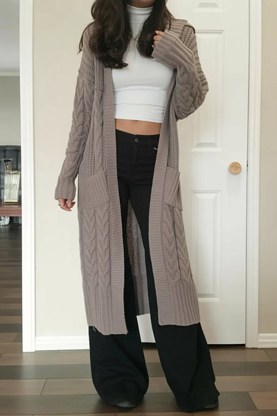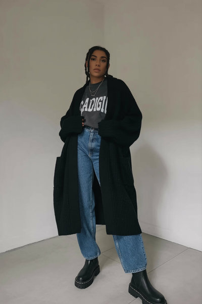 A very long cardigan over a white crop top and black straight leg pants is giving main character energy. The proportions here are really fun and the long cardigan is super cozy for walking between classes. Just make sure the crop top isn’t too cropped or you’ll freeze lol.