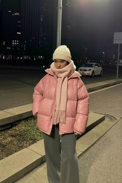 Grey jeans with a pink puffer jacket, pink scarf and white beanie is such cute and feminine look. I love adding some color in winter because everything can feel so blah otherwise. The puffer jacket is obviously super warm whilst the pink makes you stand out in a sea of black coats.