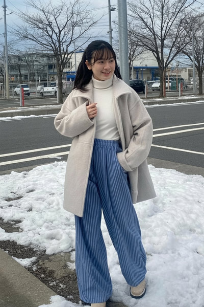 Blue striped pants with a white turtleneck and warm grey coat is a little more elevated than some of these other looks. The stripes add personality, and the grey coat is classic and polished. This is great for days when you have a presentation or just want to feel a bit more dressed up.