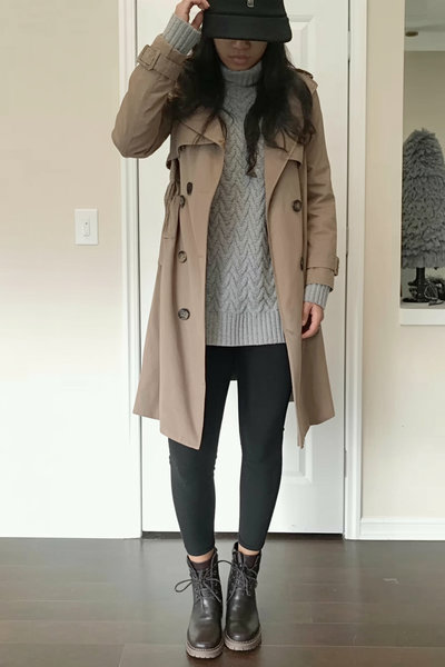 A grey longline turtleneck with leggings, brown boots, baseball cap and a then tan trench coat is such a chic combo. The baseball cap adds a sporty touch and the trench coat makes you look like you have your life together even if you definitely don’t. Brown boots with leggings never fails either.