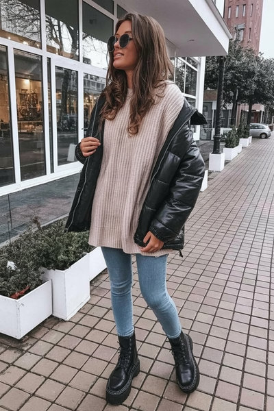 Light blue skinny jeans with platform leather boots, an oversized sweater, and shiny puffer jacket is a whole lewk. The shiny puffer is trendy without being too over the top and platform boots are a must for winter in my opinion. This outfit has good proportions with the fitted jeans and oversized top.