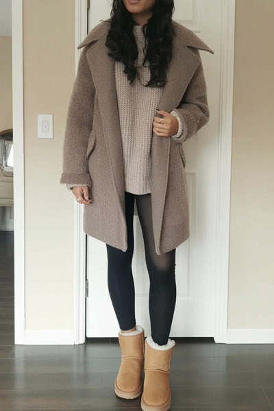 An oversized sweater with Uggs and a beige wool coat is the ultimate cozy winter outfit. Uggs get a bad rap sometimes but they’re honestly so warm and comfortable for walking around campus all day. The wool coat elevates the whole thing so you don’t look like you’re wearing pajamas (even though it basically feels like it).