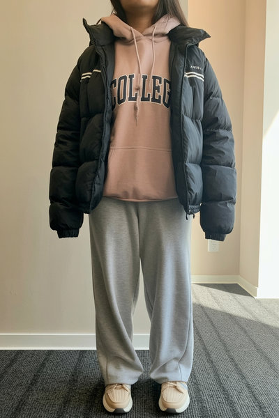 Sometimes you overslept and you just need comfortable clothes to run to class – these comfy grey joggers with a pink hoodie and black puffer jacket is peak ‘i don’t care today’ athleisure. This is perfect for those days when you have class but also want to hit the gym after or just need to be comfortable. The pink adds some fun to an otherwise basic outfit.