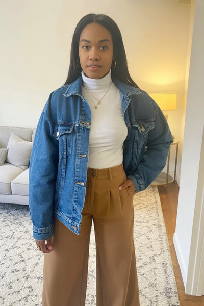 Tan pants with a white turtleneck and oversized denim jacket are simple but effective. Denim jackets might not seem warm enough but when you layer them right they totally work. The tan and white combo is really clean and put together without trying too hard.