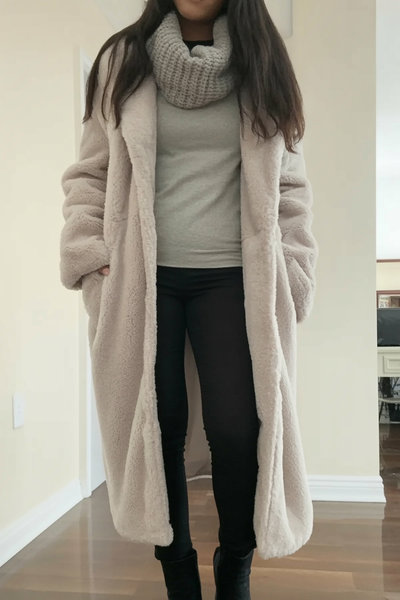 A comfy fit with a tee and leggings, grey scarf and faux fur long eggshell white coat is so extra in the best way. The faux fur coat makes even the most basic outfit underneath look fancy. Plus you’ll feel like you’re walking around in a cloud which is always nice when it’s cold as heck outside.