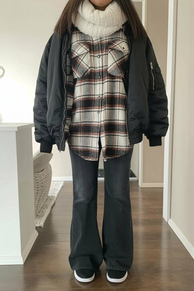Okay so bootleg dark jeans are making a comeback and I’m here for it! Layer an oversized warm flannel shirt with a white scarf and black bomber jacket for that perfect cozy-meets-cool aesthetic. This outfit to me says “I tried but not too hard” which is basically the college motto right?