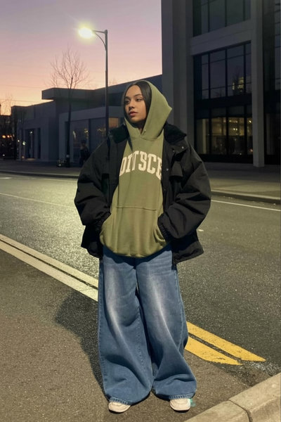 Wide leg blue jeans with a green hoodie and black jacket is super simple but it works. The proportions are really in line with the trends right now and the green adds a nice pop of color when everything else feels maybe a bit dark and gloomy in winter. Plus hoodies under jackets is just that perfect combo for staying warm.