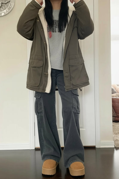 Grey cargo pants are having a moment and pairing them with tan platform boots, a casual sweatshirt, and khaki jacket is such a cool laid back look. The platform boots give you some height, and the whole outfit has that utilitarian vibe that’s really trendy right now. Pockets for days too which is always a useful thing to have!